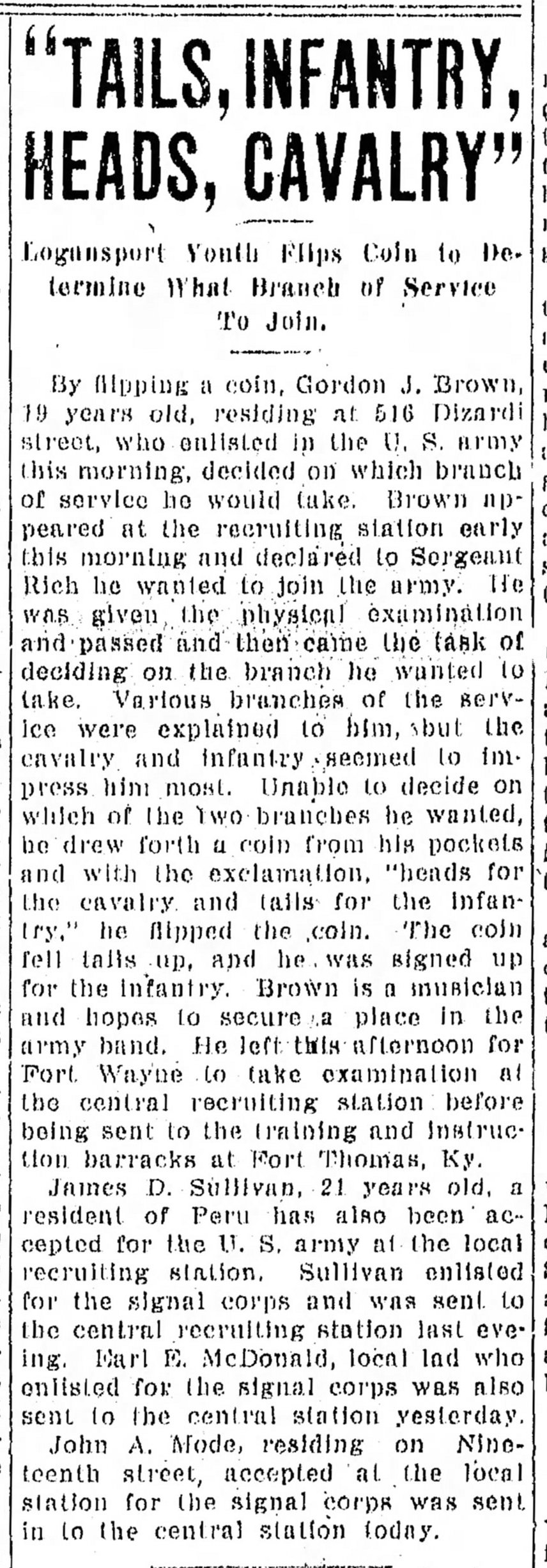 | Tails, Infantry, Heads, Cavalry | | SULLIVAN, James D | Peru | | Signal corps | April | 17 | 1917 | Logansport Pharos Reporter | Image |