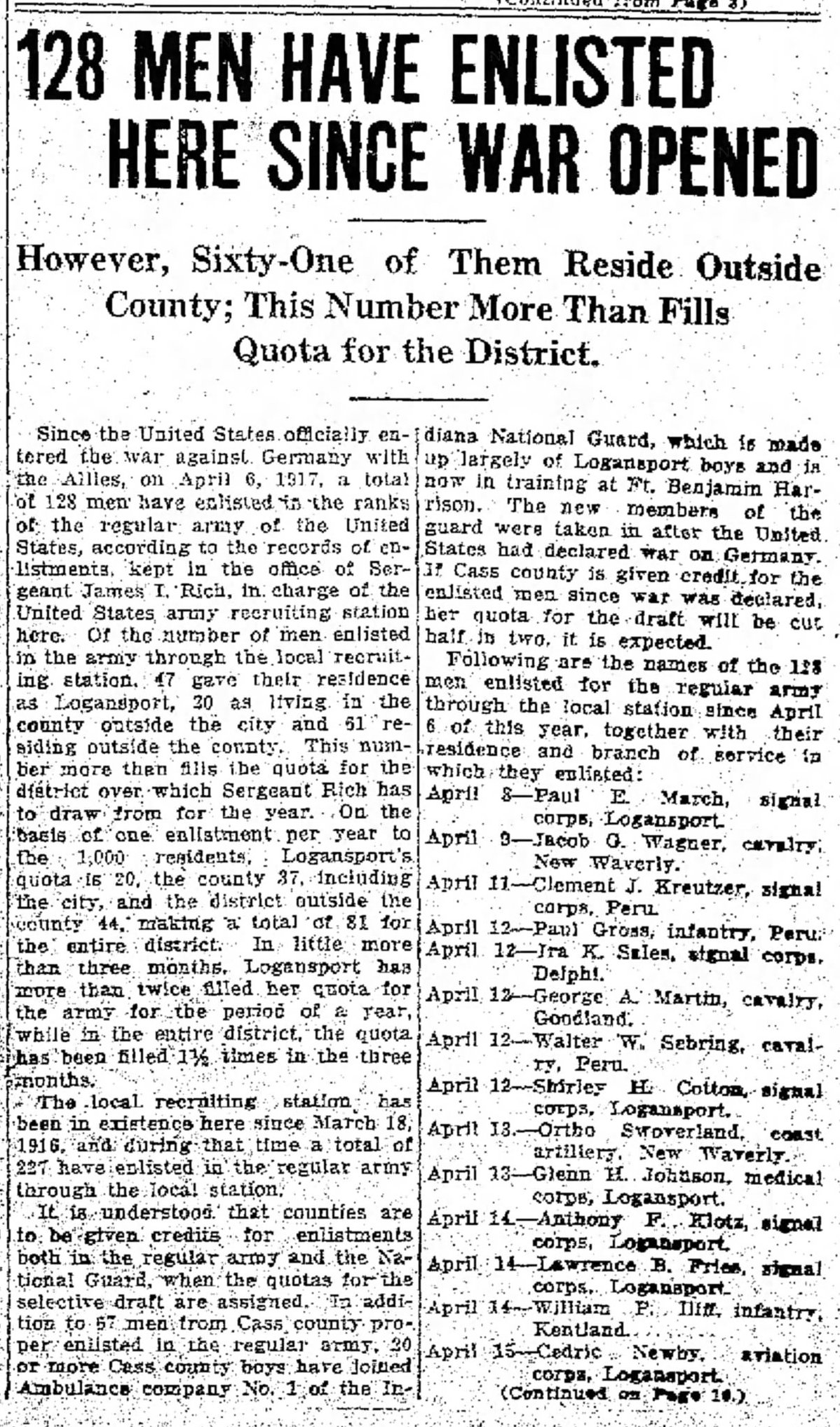 | 128 Men Have Enlisted Here Since War Opened | | GROSS, Paul | Peru | | Infantry | July | 14 | 1917 | Logansport Pharos Reporter | Image |