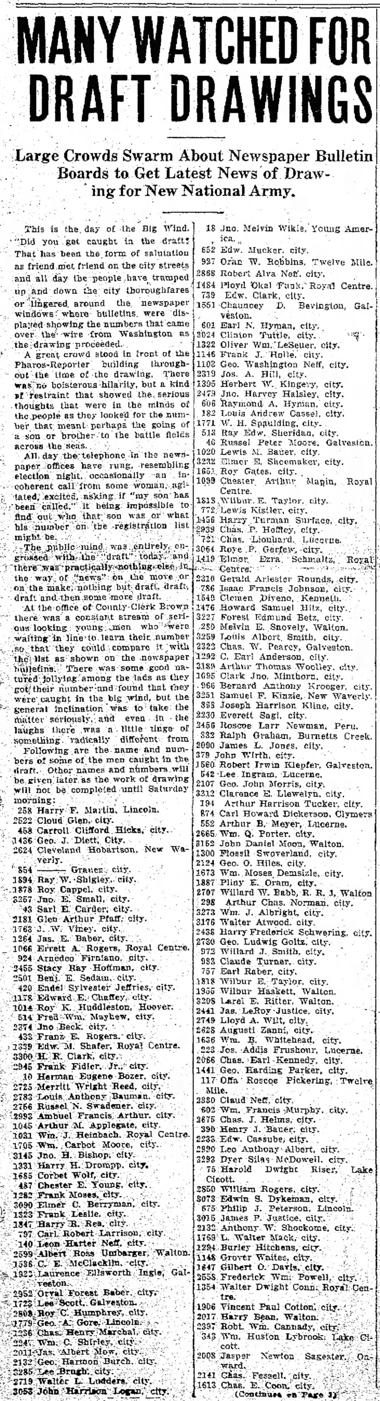 | Many Watched For Draft Drawings | | NEWMAN, Roscoe Larr | Peru | | Draft# 2456 | July | 20 | 1917 | Logansport Pharos Reporter | Image |