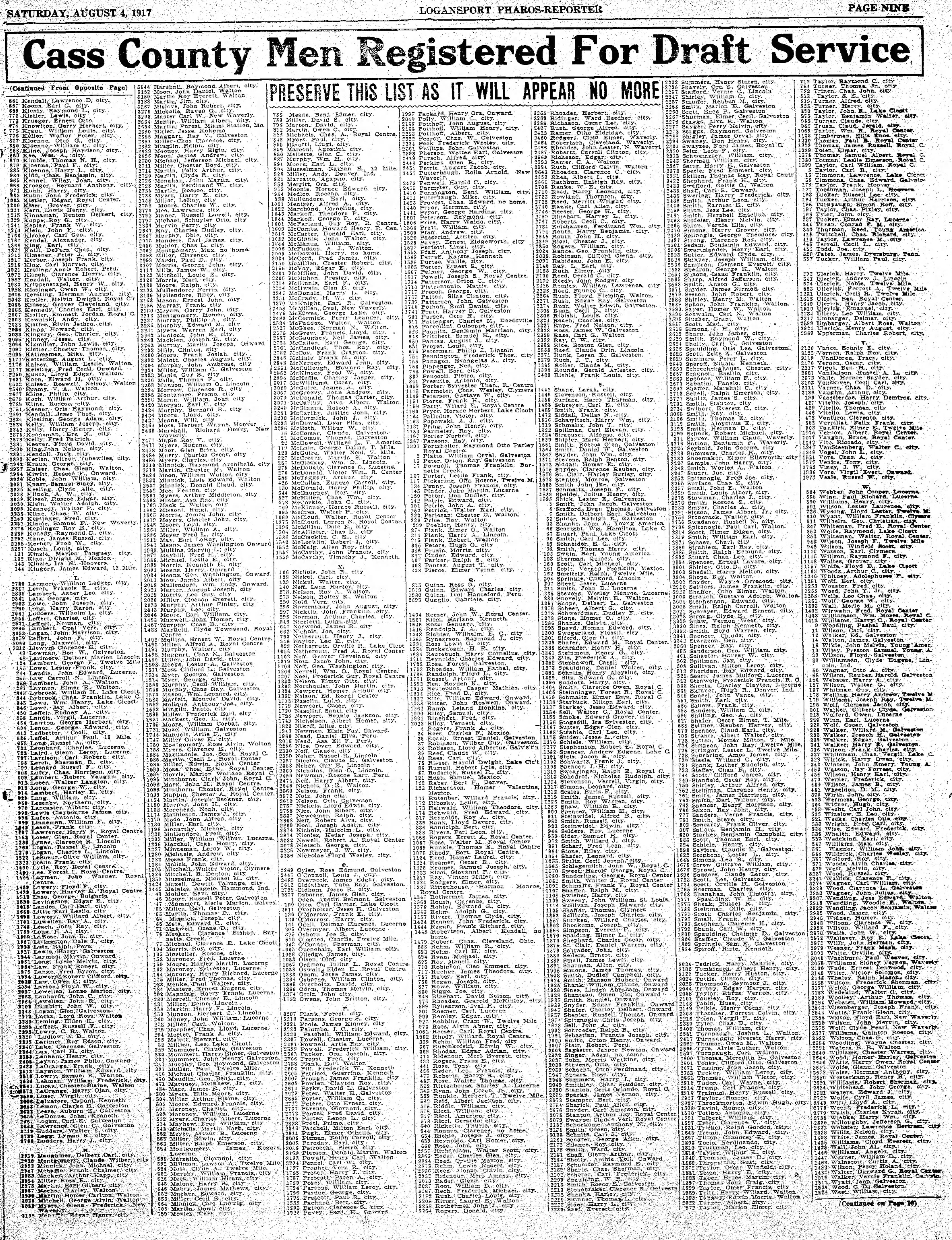 | Cass County Men Registered for Draft Service | | ELBURN, Henry | Peru | | Draft# 3117 | August | 4 | 1917 | Logansport Pharos Reporter | Image |