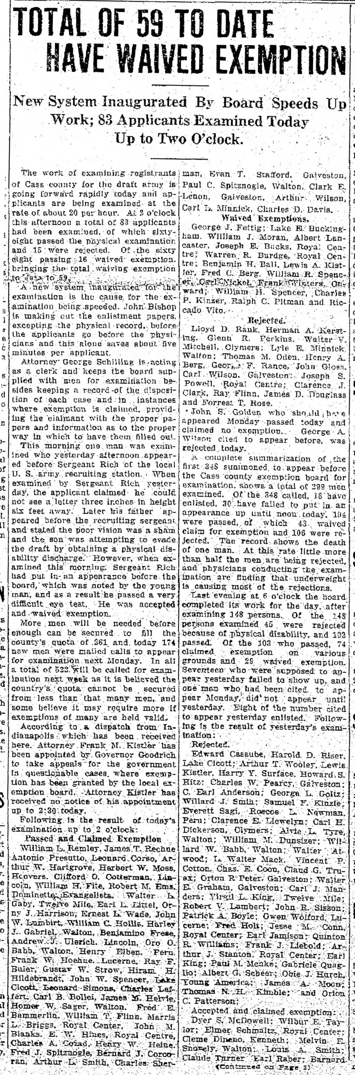| Total of 59 Today Have Waived Exemption | Rejected | NEWMAN, Roscoe L | Peru | | | August | 8 | 1917 | Logansport Pharos Reporter | Image |