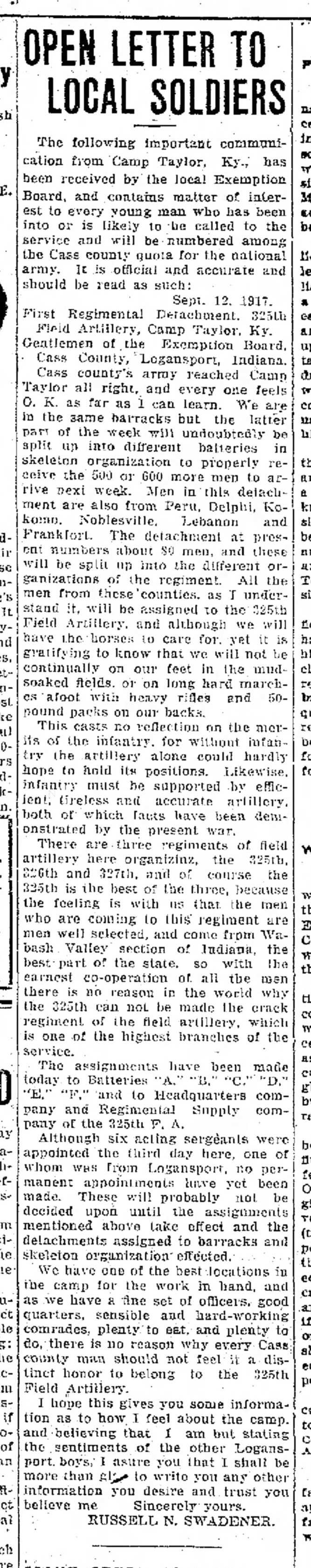 | Open Letter to Local Soldiers | Camp life at Camp Taylor for Peru soldiers | SWADENER, Russell N | | | | September | 14 | 1917 | Logansport Pharos Reporter | Image |
