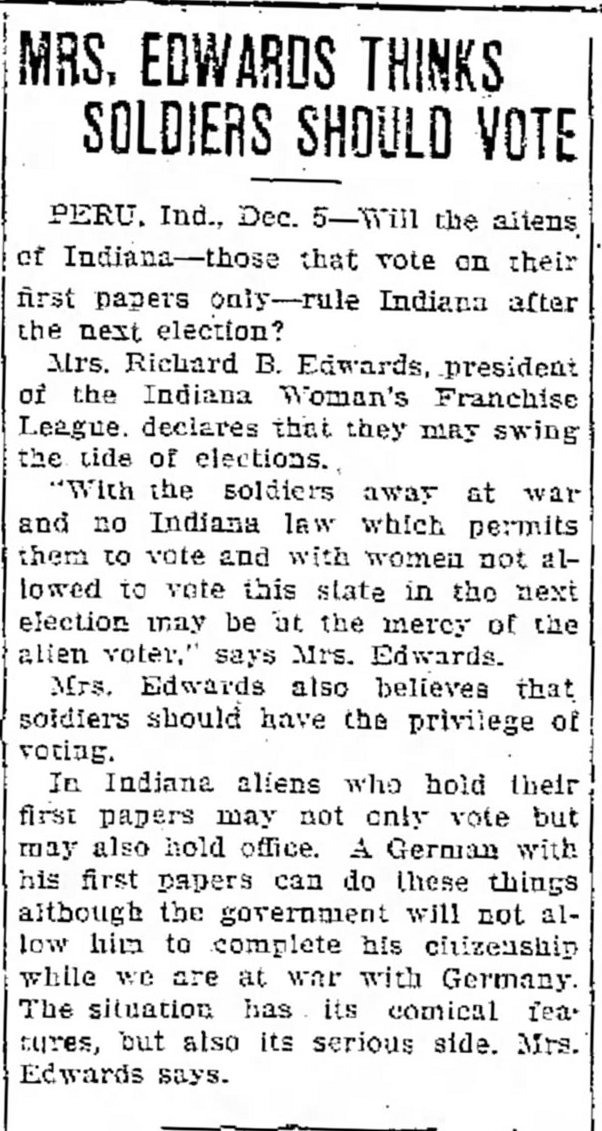 | Mrs Edwards Thinks Soldiers Should Vote | | EDWARDS, Richard B (Mrs) | | | | December | 5 | 1917 | Logansport Pharos Reporter | Image |