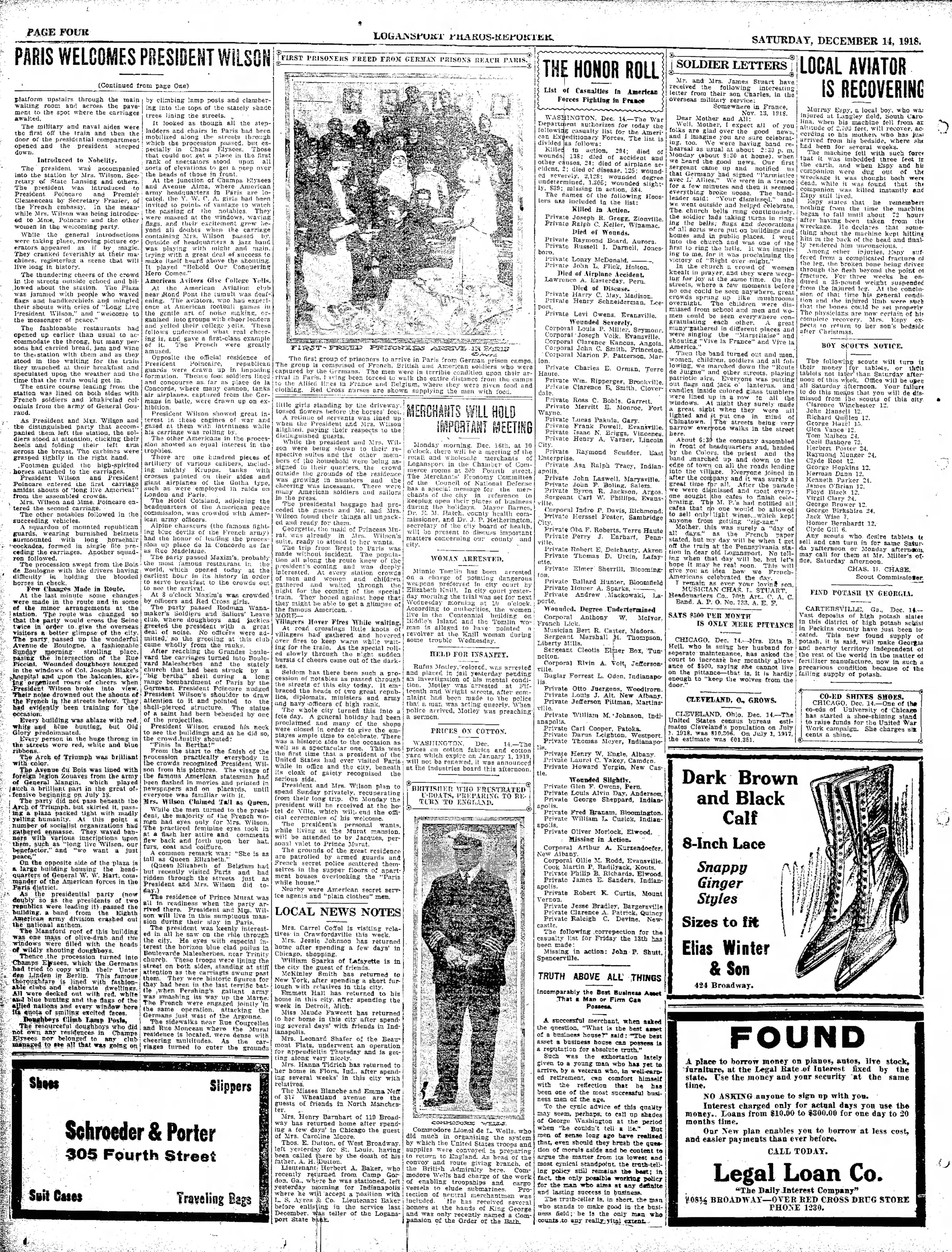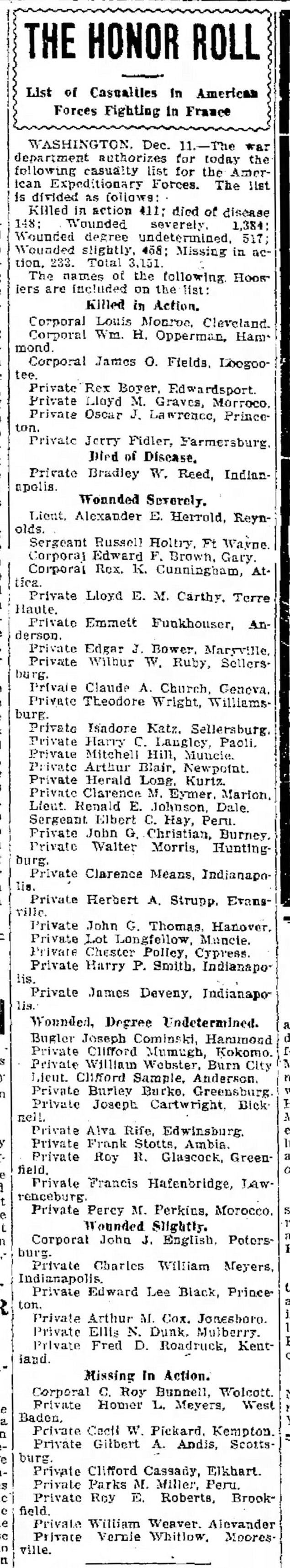 | The Honor Roll | List of Casualties in American Forces Fighting in France | OWENS, Glen F (Pvt) | Peru | | | December | 14 | 1918 | Logansport Pharos Reporter | Image |