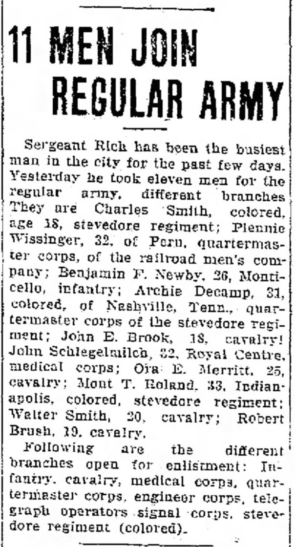 | 11 Men Join Regular Army | | WISSINGER, Plennie | Peru | | Quartermaster's corp of the railroad men's company | October | 3 | 1917 | Logansport Pharos Reporter | Image |